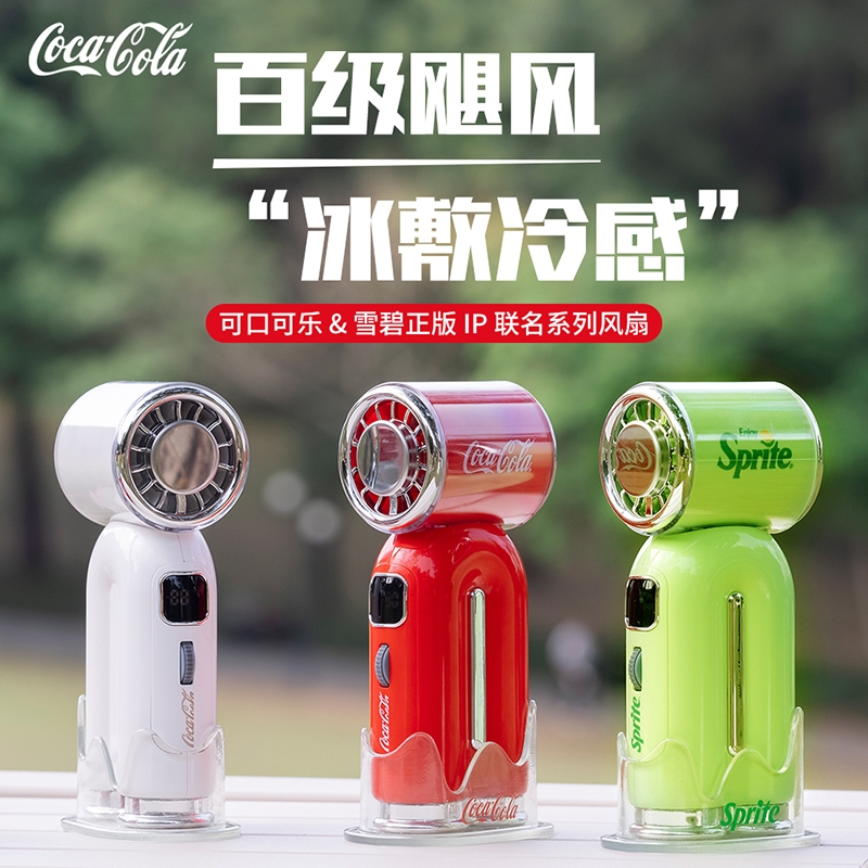 可口可乐、雪碧正版授权联名,经典红白绿配色;搭载高速无刷电机,百档风速可调,风力强劲,瞬间吹散;数显电量+长续航,实时显示剩余电量,告别续航焦虑