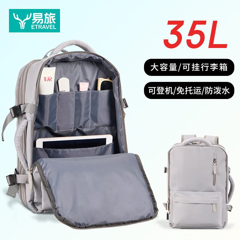 轻量设计,功能兼备;三仓设计,多隔层分区收纳,空间合理;外置USB充电口,减震独立电脑仓;优质面料,防泼水;可套拉杆箱,解放双手