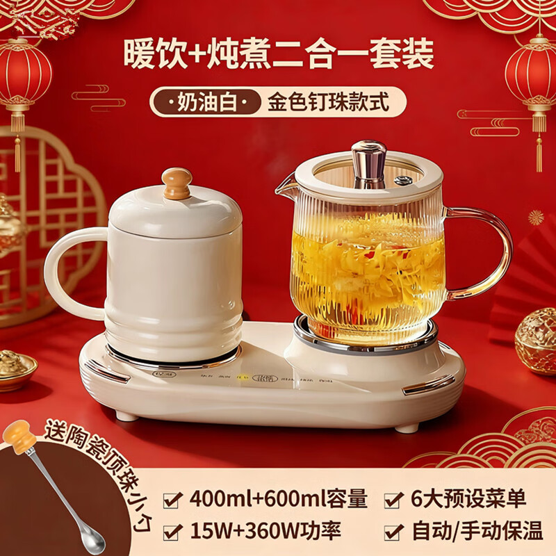 双底座养生壶炖煮二合一,左边保温,右边炖煮同享;;1壶1杯一套装,6大预设功能,15W暖饮,375W;600ML炖煮养生杯+400ML恒温杯二合一;;分体式养生壶杯壶,清洗方便,提壶即饮;;高硼硅玻璃壶+白瓷饮水杯,高温防干烧自动断电;