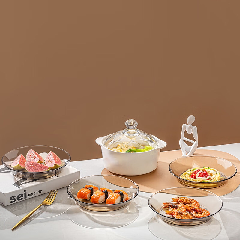 纹理设计 ,清新自然 ,简约而不简单;双耳设计,拿取方便;圆润盘口,琥珀色玻璃,与美食相得益彰