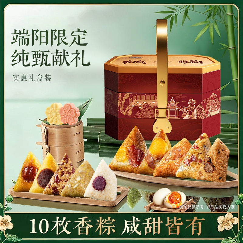 加入PPT(粽子)国际标准第一起草单位。;始于1921年的百年品牌,吃粽子就选五芳斋。;国家级非物质文化遗产名录,全国首批中华老字号企业。;粽子第一股A股上市企业,质量安全,品质保证。;礼盒配置丰富不单调,都是家庭必需品。