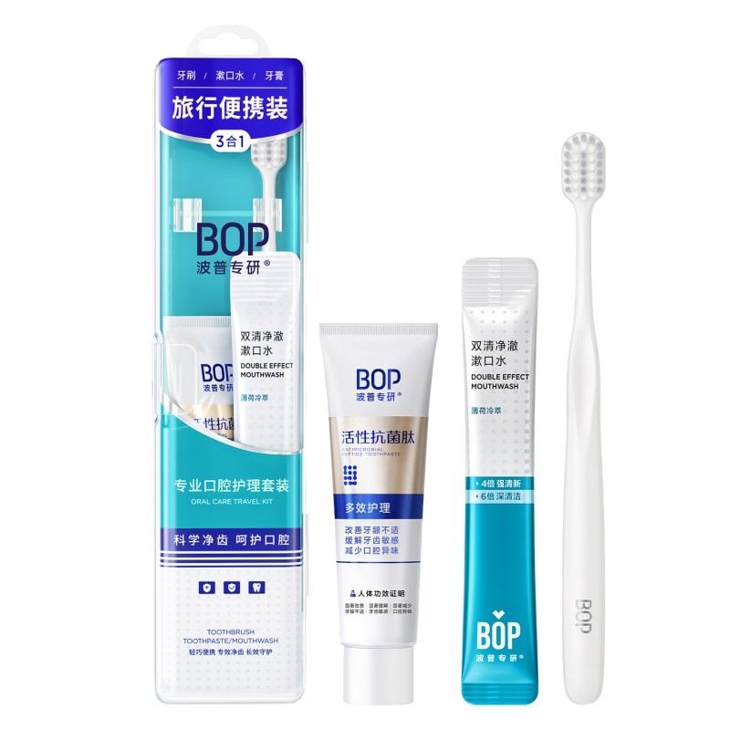便携出行,一次搞定;科学净护牙刷,净护合一;抗菌肽系列漱口水+牙膏,守护口腔健康