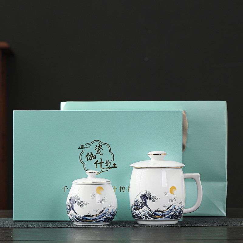瓷伽什 蒸蒸日上羊脂玉办公杯茶叶罐套组CJS-YZY-031