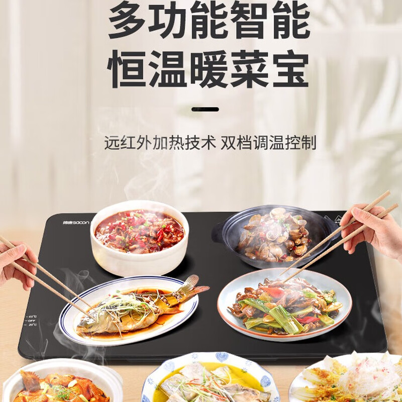 整体拉伸金属底板,绝缘+隔热双料工程塑料一体成型;一机多用:暖菜,温酒,温奶,暖菜,温炖,保温,解冻;安全防烫设计,精准控温,高强度钢化玻璃;
