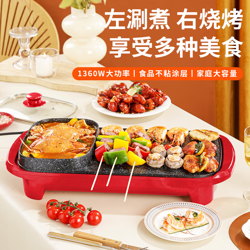 1360W双发热管大功率加热快均匀,分体加热;多档调节,智能温控,防烫隔热手柄;一边在烹饪火锅时,另一边可同时烤、可煎,荤素同时制