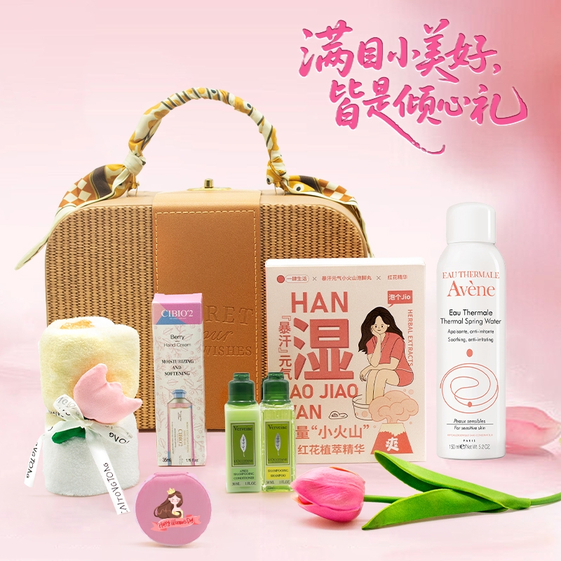 暖棕藤编礼盒,复古质感,春日氛围感拉满;欧舒丹洗护 + 雅漾喷雾,实用护肤配齐;丝巾点缀设计,送礼自留尽显温柔气质