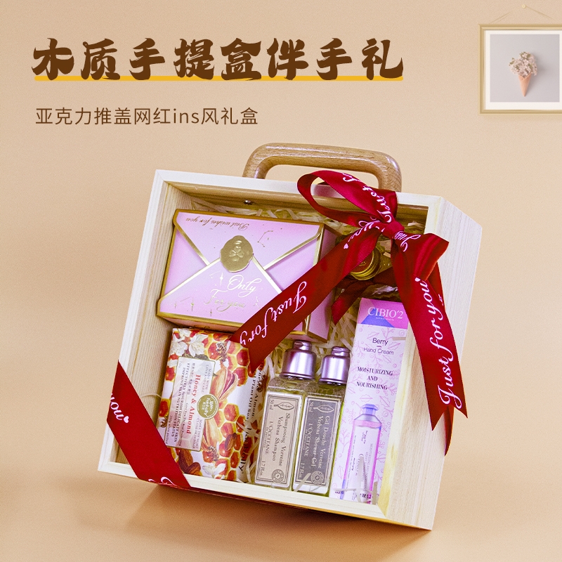原木质感礼盒,欧舒丹洗护 + 蜂蜜,实用又暖心;糖果 + 香皂,甜韵满满,伴手礼首选;丝巾点缀,木质手提设计,精致有格调