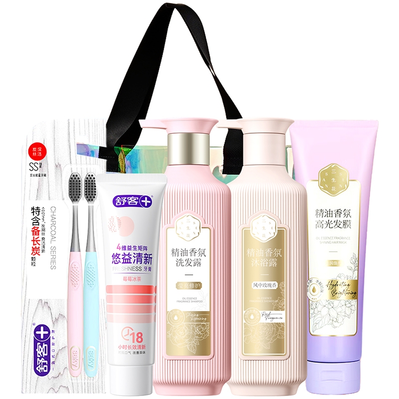 ¥ 120洗发水修复干燥、毛躁、受损发丝,使头发更加柔顺光泽;沐浴露沉醉于玫瑰的馥郁芬芳,深层滋养肌肤;发膜提升头发的光泽度,使秀发看起来更加亮丽;牙膏添加食品级益生菌,有效减少口腔有害细菌滋生;牙刷特含备长炭颗粒,令刷毛干爽洁净,口气更清新