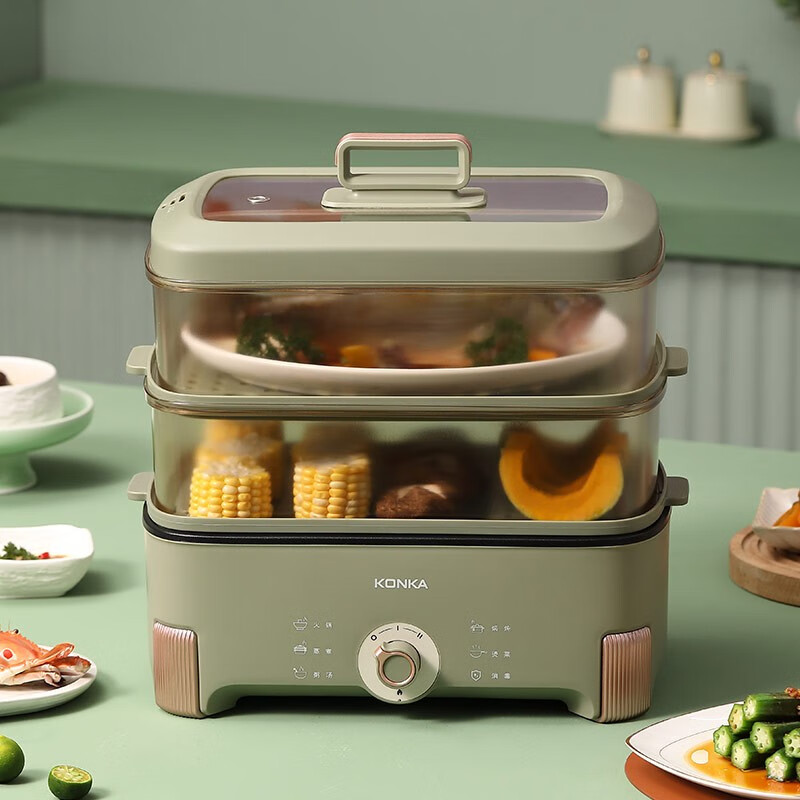 超温自动断电,安全妥当;两档控制,快煮/慢热,轻松调节;一锅多用,上蒸下煮