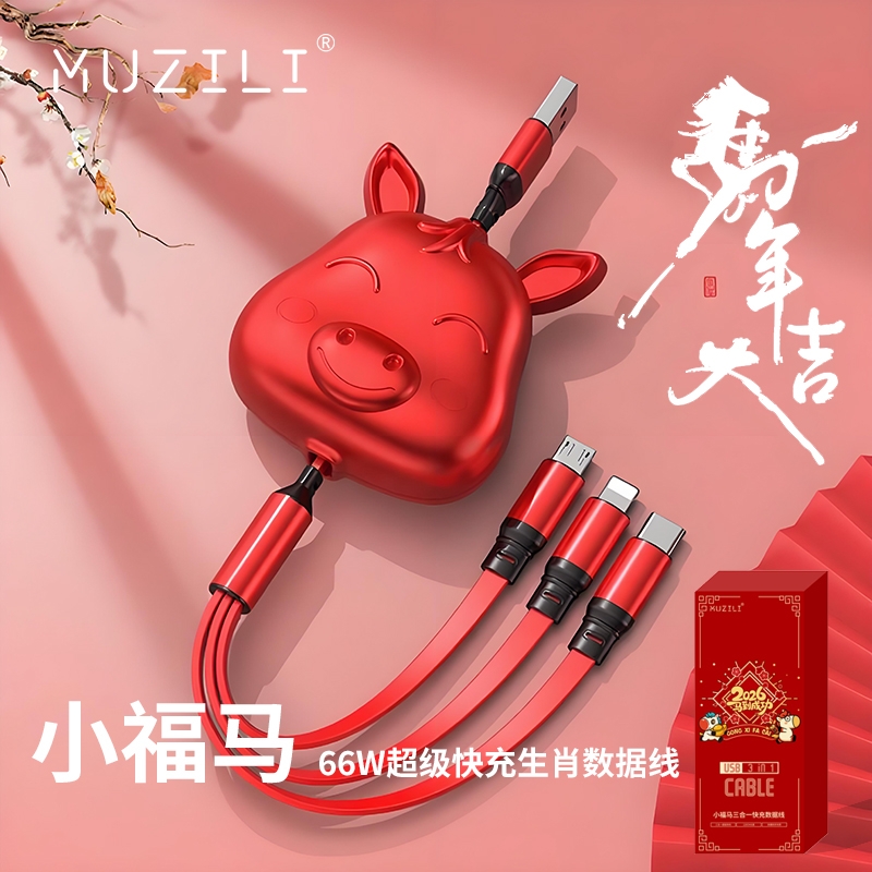 66W超级快充,充电更快;马年元素造型,一体成型充电头;三种接口满足各种手机;1.2米长度设计,使用方便;编织线耐磨耐用,不易折断