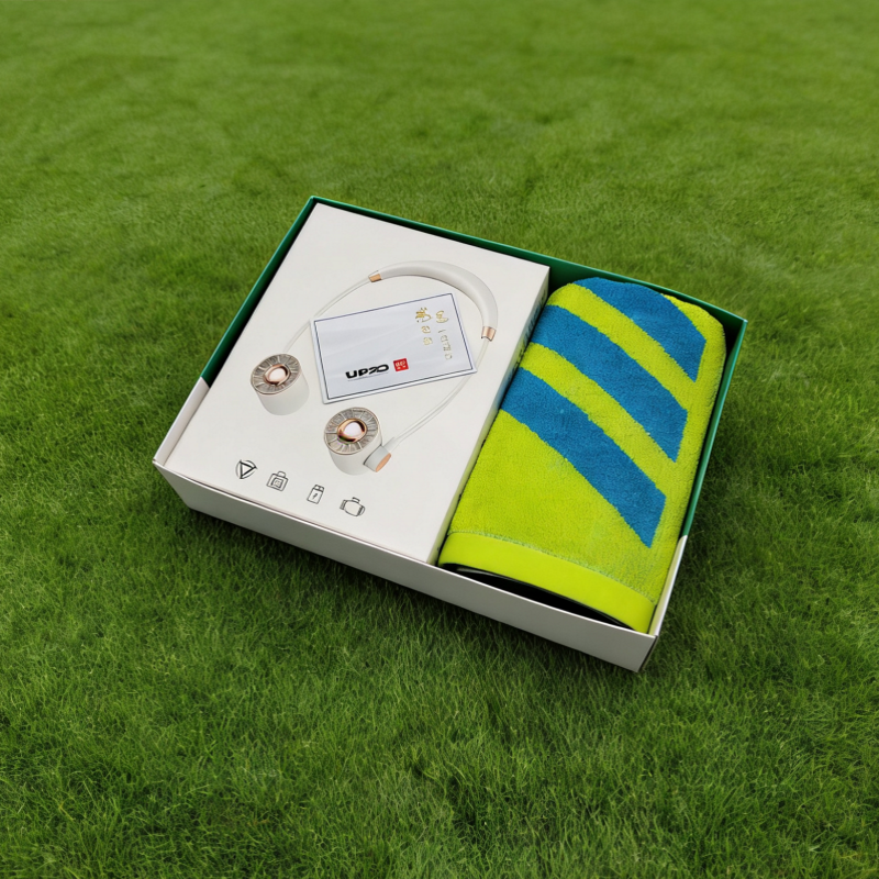 挂脖两用风扇 高续航 靓丽外观 挂脖台面两用设计;纯棉提花运动巾 精梳棉材质 运动巾尺寸克重设计;天地盖礼盒加手提袋 优质伴手礼