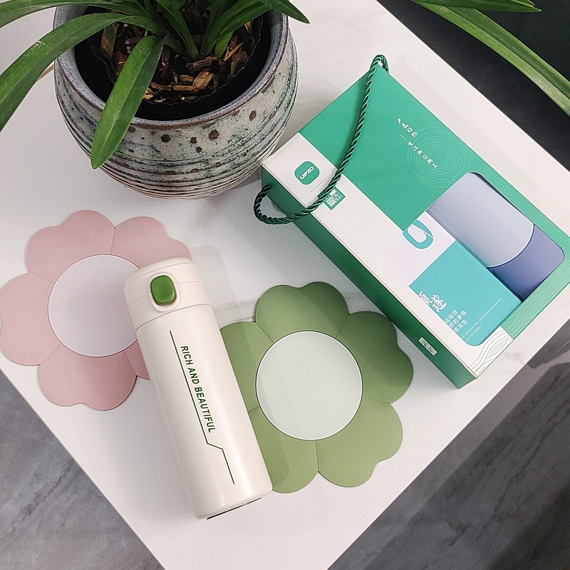 保温杯420ML 内胆304 杯盖PP;花瓣隔热垫设计靓丽 产品优质;礼盒设计简约 可手提 两色可选