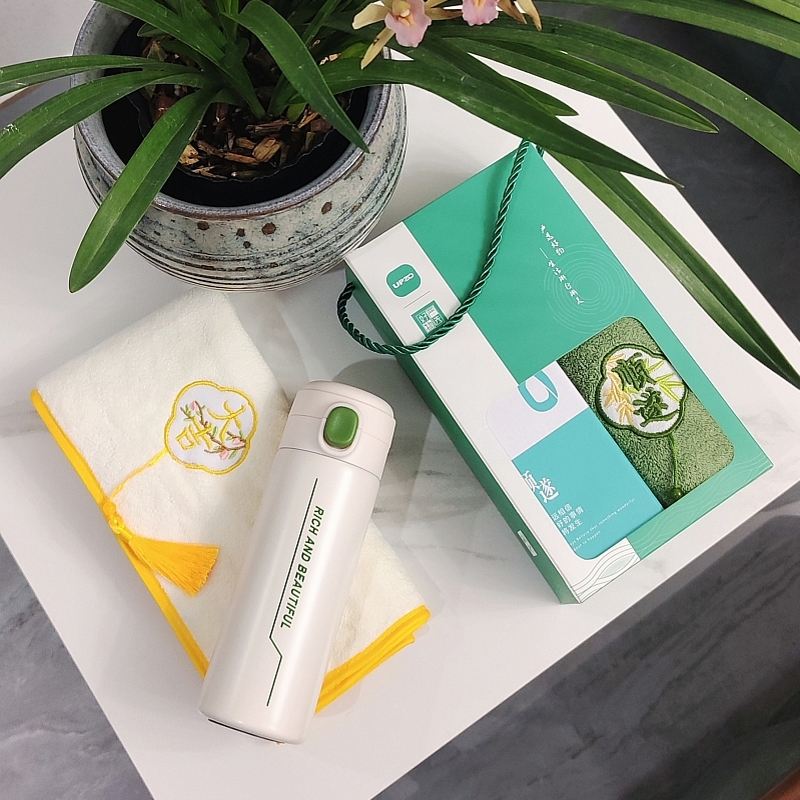 加入PPT420毫升高颜值保温杯 304内胆 精美设计文案;棉柔巾60抽每包 加厚设计平方克重70克;微米国风毛巾 精制包边 厚实面料 结合国风刺绣