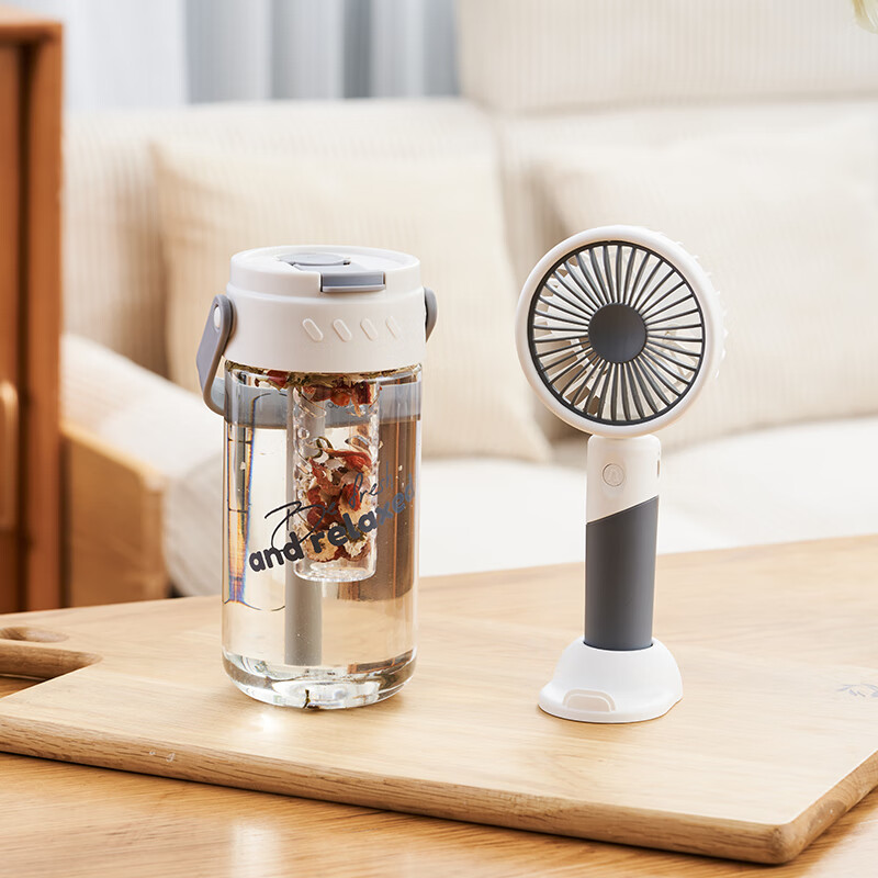 一茶一凉,夏日随身双舒适;风扇手持 立放双模式小巧轻便揣进包,走哪都能吹哪;清新颜值,实用也养眼