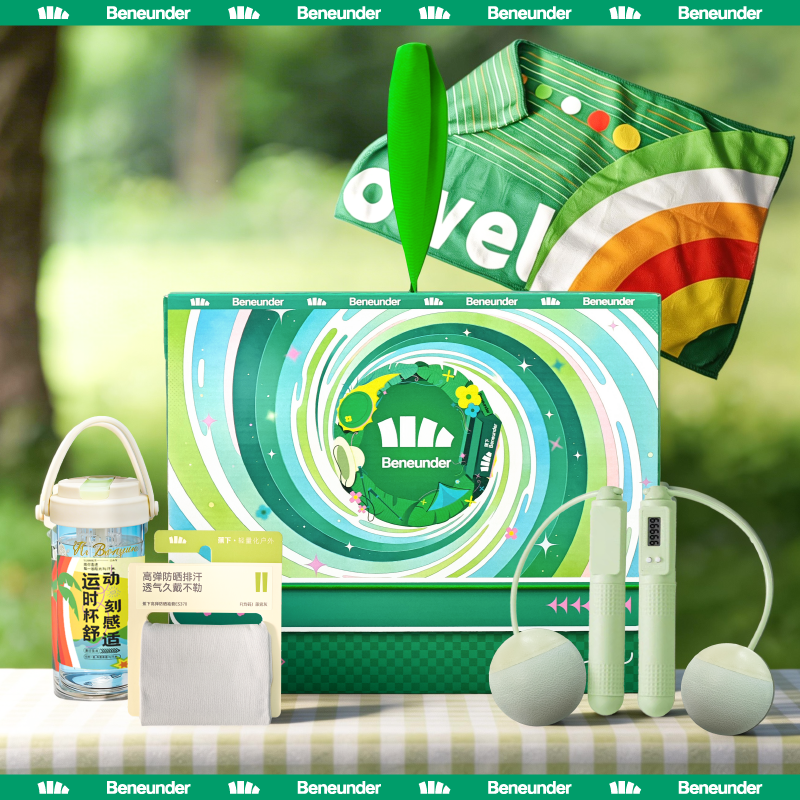 炫彩跳绳 采用优异材质结合时尚设计风格 ;七彩运动冰巾精选冷感面料结合数码印花工艺 ;运动水杯采用PC杯体 PP杯盖 可手提适中容量
