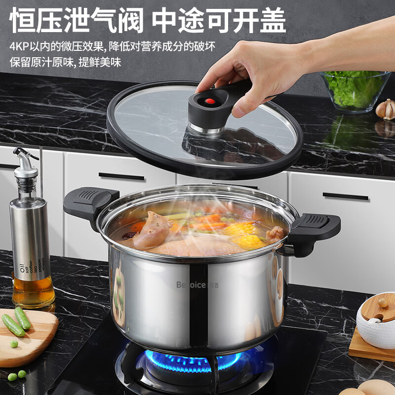 锅身材质为304不锈钢,安全健康,坚固耐用;双耳锁压,微压焖烧,蒸汽回流,锁住营养;可立可视钢化玻璃盖,可视化微压美食看得见;上拉胶阀,轻松泄压,减少等待时间;不挑炉灶,电磁炉、燃气灶均可使用
