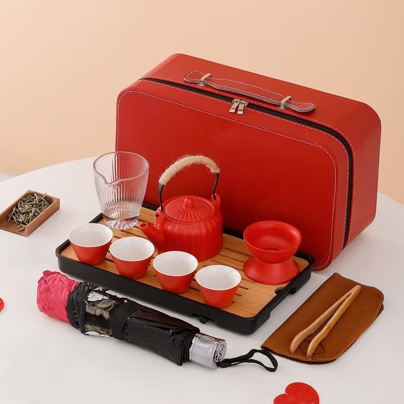 开门红喜庆色彩商务套装,实用型礼品;简约日式粗陶风,旅行茶具,搭配实用雨伞,茶盘;双层茶盘,高档皮箱装。