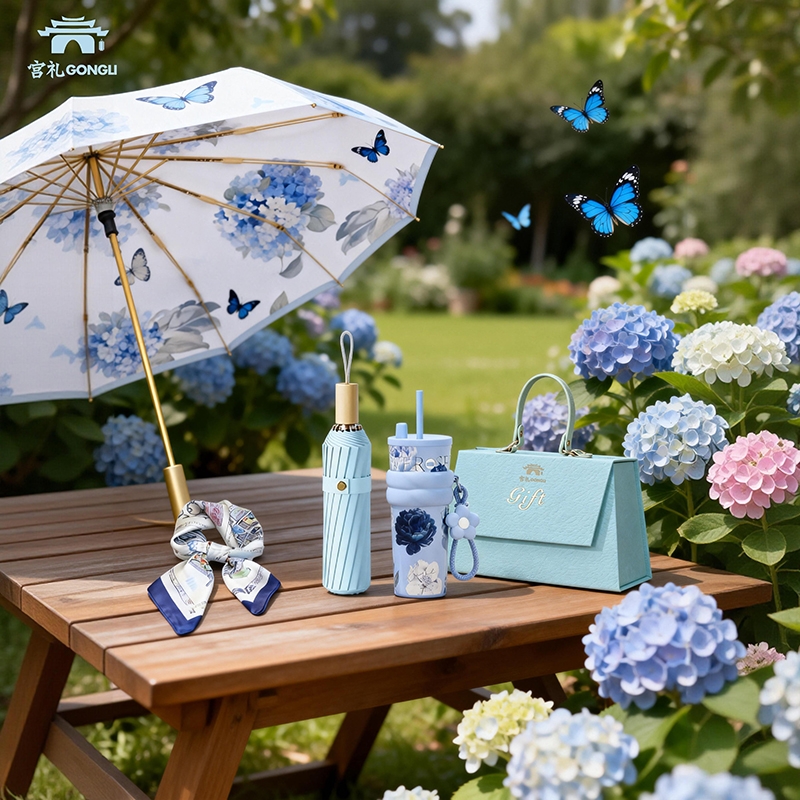蓝蝶逐风,瓷杯映影,把自然的灵动,装进行囊里。;海棠落瓷,伞底藏春,把故宫的烂漫,揉进烟火日常。;一伞一巾一杯,藏着花间蝶影,也藏着四季的温柔。