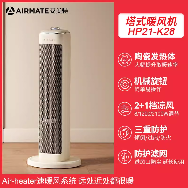 [2+1档调节]30/1200/2100W,;倾倒断电,过热保护,防火材料;进风口防尘滤网,延长发热体使用寿命