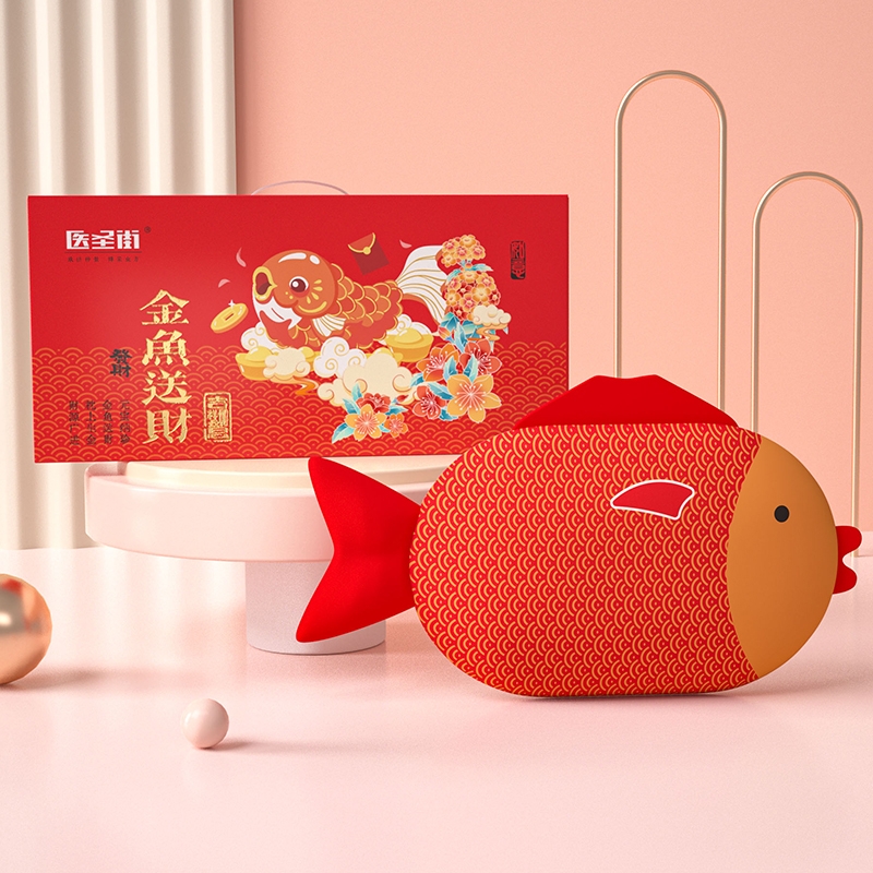 国风礼盒,萌趣鱼枕搭配沙金小物;国潮萌鱼造型抱枕,红金配色喜庆吸睛;中草药填充的鱼枕,结合传统萌趣设计