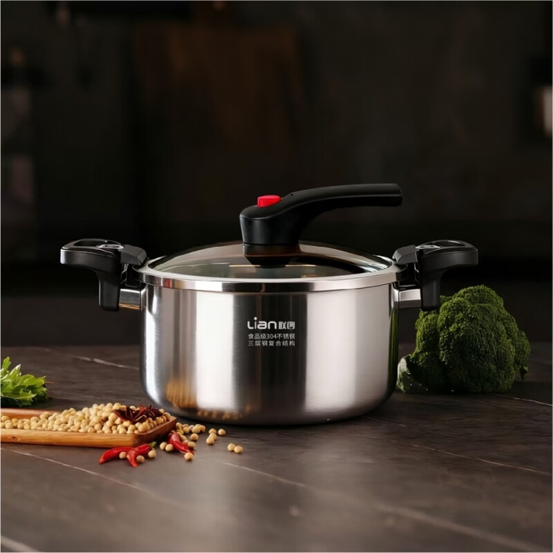高效省时,减少烹饪时间;5秒泄压一盖,随时加菜,添料;健康无涂层,加厚304三层不锈钢