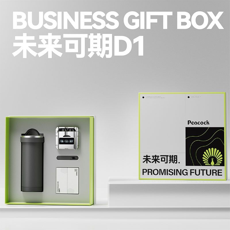 礼盒融合实用科技与商务格调;Peacock孔雀提手保温杯,316不锈钢内胆;机甲风耳机,强劲音效与降噪功能