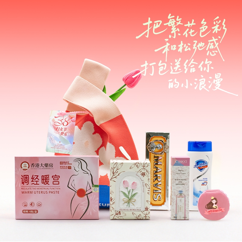 针织花漾手拎包,实用出街两不误;6 件贴心好物,从护齿到暖宫全呵护;附赠郁金香 + 贺卡,仪式感直接拉满