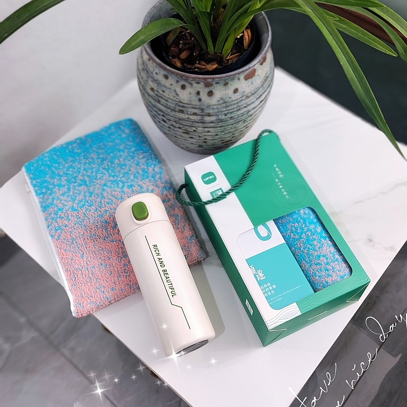 炫彩系列毛巾精选精梳棉材质结合色织工艺;炫彩保温杯 420毫升容量 304内胆 靓丽外观;组合套装
