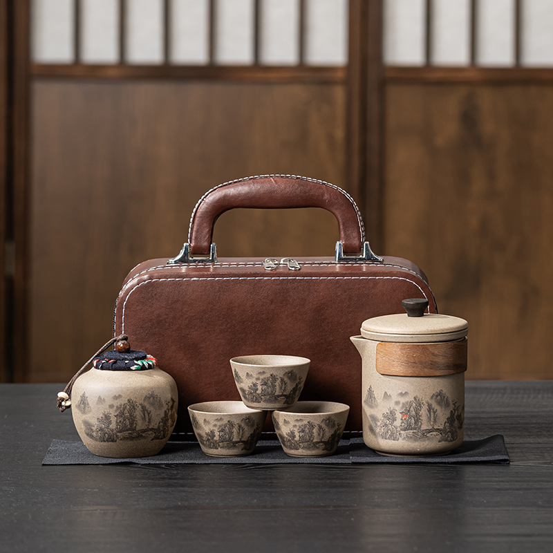 茶具表面绘有山水图案,具有浓郁的中国风;配套的棕色皮质手提箱设计精致,方便携带和存放茶具;山水图案在中国文化中象征着宁静、悠远和自然