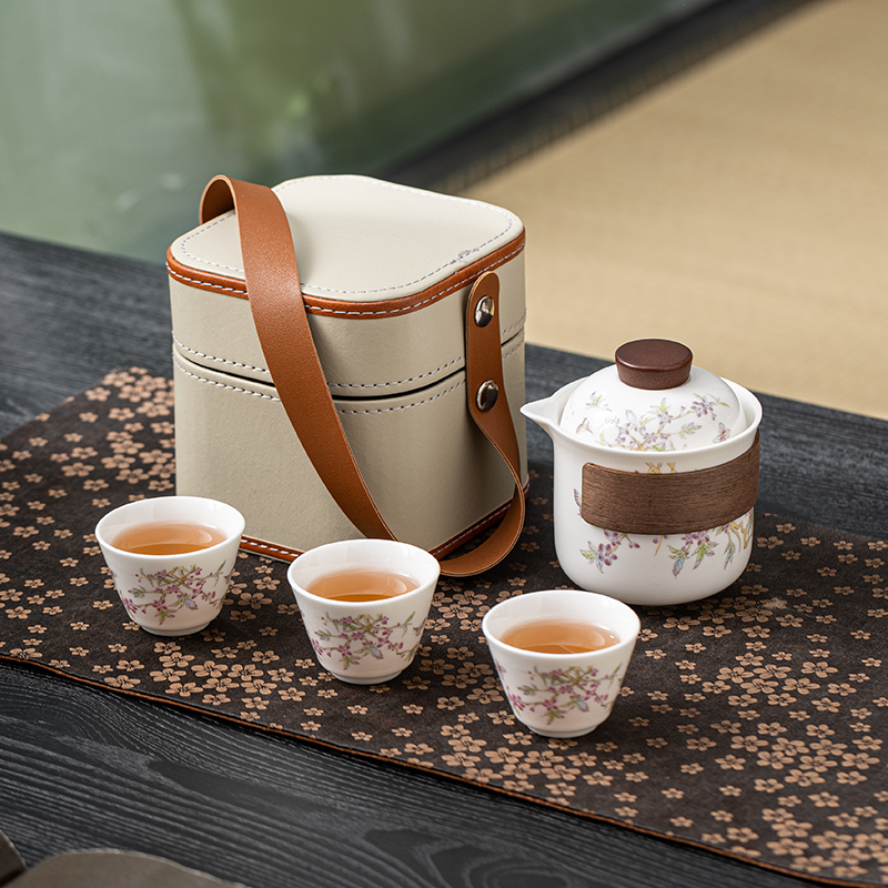 茶具表面绘有紫藤花图案,色彩柔和淡雅,富有自然美感;采用白瓷材质,质地细腻光滑,观感上洁白纯净;配套的四方包设计精巧,带有提手,方便携带和收纳
