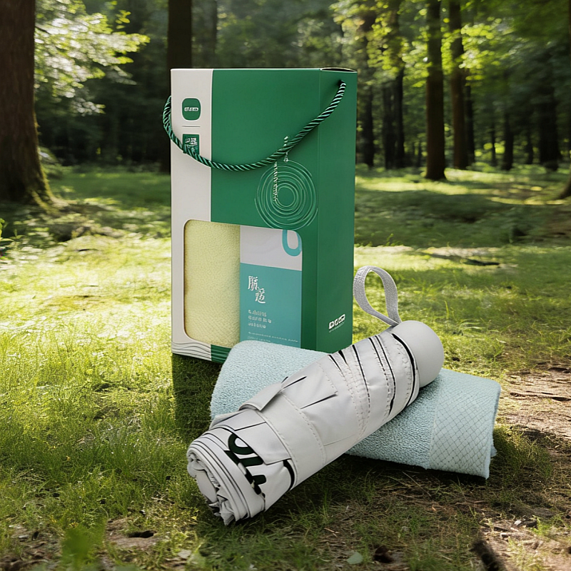 五折六骨晴雨伞 胶囊伞尺寸设计 黑胶隔热;迪穆系列竹纤维毛巾起圈部竹纤维 吸湿透气抗菌抑菌;夏季清凉组合套装