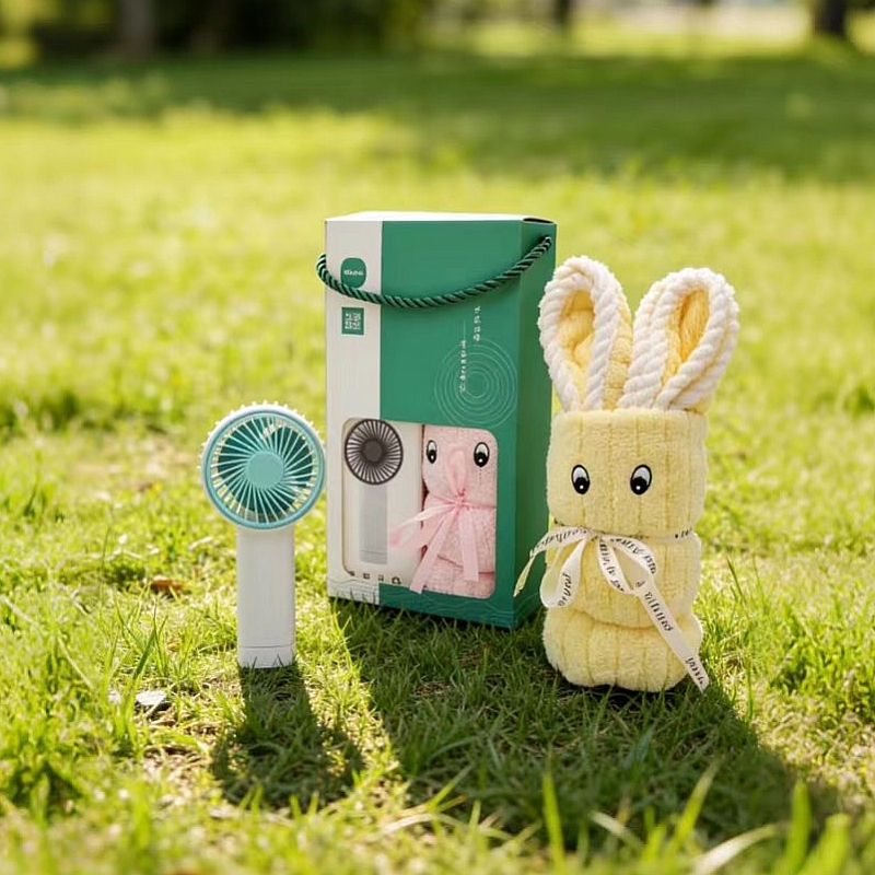 欢喜小兔毛巾高平方克重结合精美包边与手工折叠小兔;清凉小风扇 500毫安 续航90分钟左右 风力三挡;夏季清凉组合套装