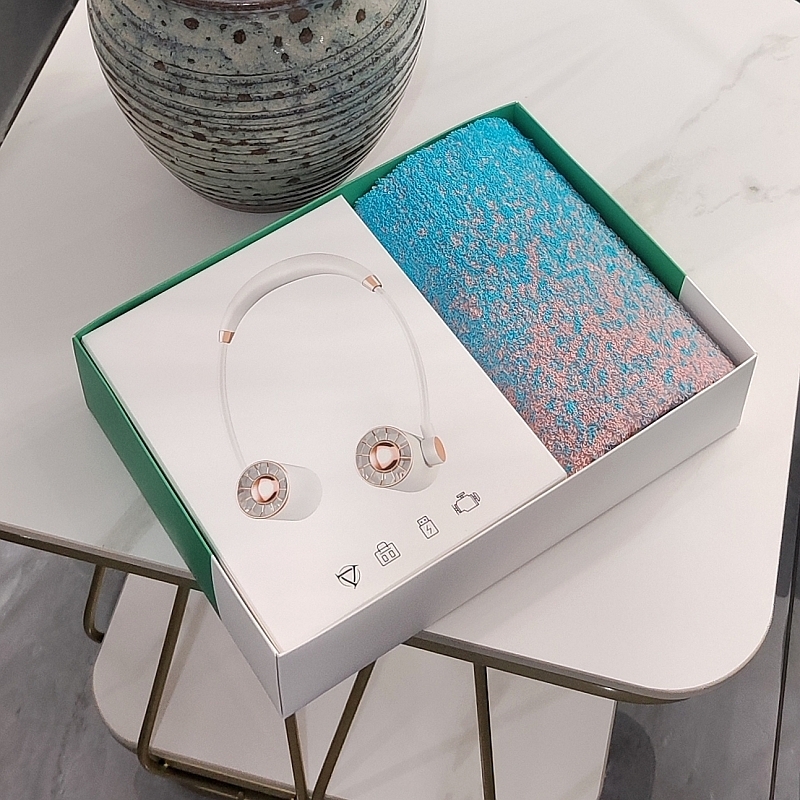 挂脖风扇 1200毫安 3档可调 挂脖设计解放双手;炫彩系列毛巾精选精梳棉材质结合色织工艺;夏季清凉组合套装