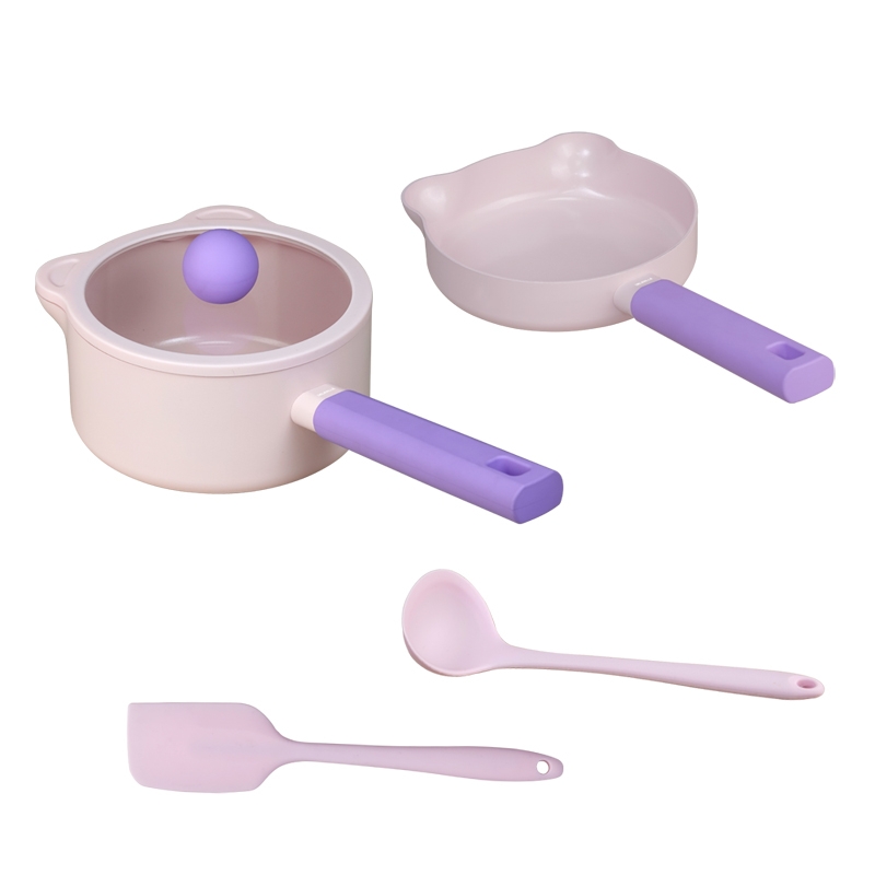 组合实用 一应俱全;色彩缤纷 清新靓丽;防滑防烫 胶木手柄;防滑底 明火适用