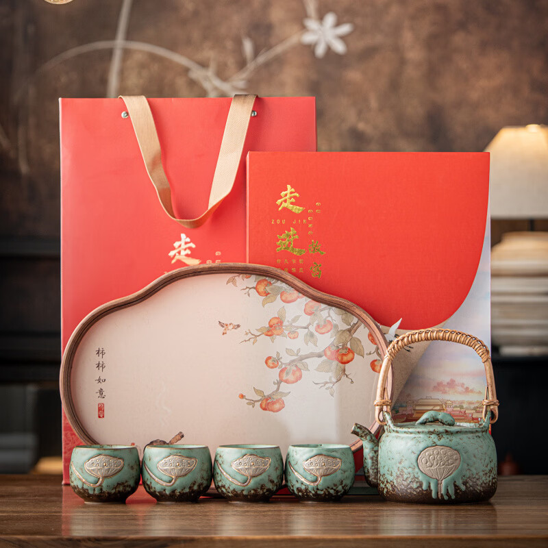 复古青苔釉,千年瓷艺的沉淀与传承。;新颖百搭耐看,浮雕莲蓬,简约造型。;一壶四杯一盘,尽显东方茶道韵味。