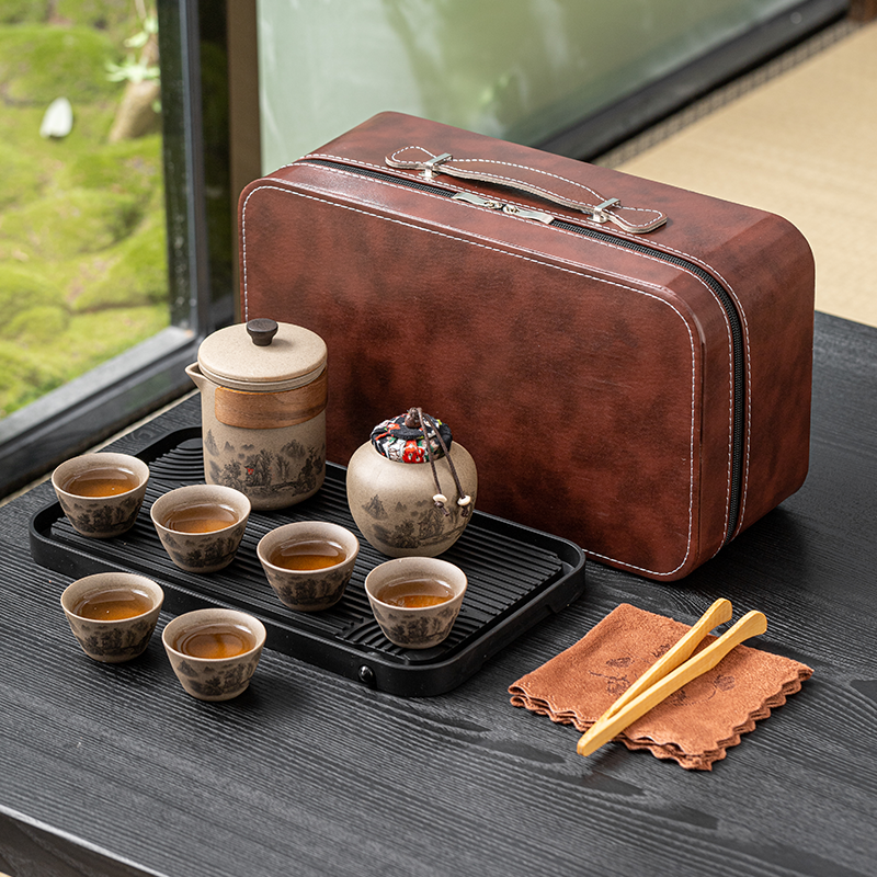 茶具表面绘有山水图案,具有浓郁的中国风;配套的棕色皮质手提箱设计精致,方便携带和存放茶具;山水图案在中国文化中象征着宁静、悠远和自然