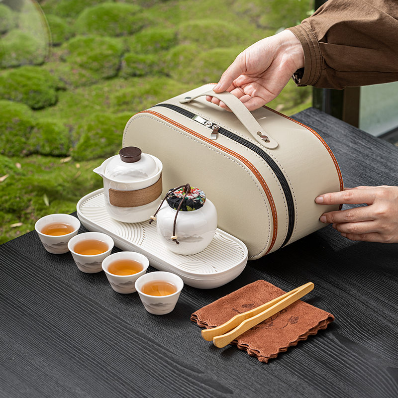 茶具表面饰有山水图案,简约而富有意境;具为白色陶瓷材质,给人干净、雅致之感;配有专门的收纳包,方便携带,适合外出旅行