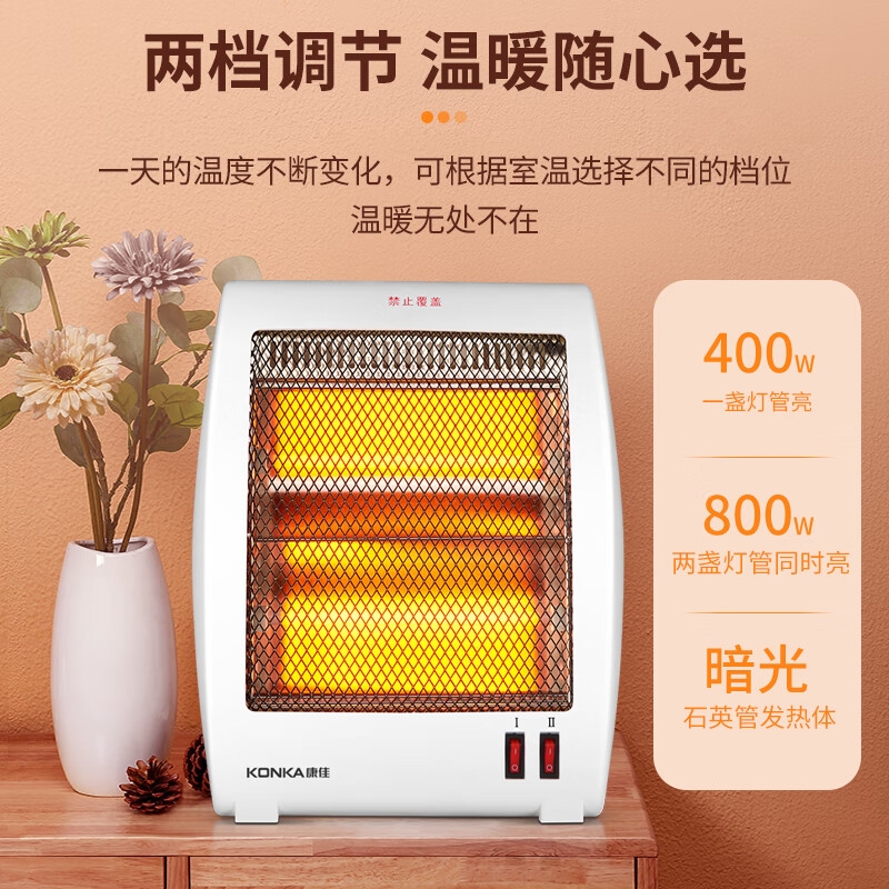 即开即热,热力强劲; 400W/800W二档功率调节;;防倒开关,倾倒自动断电 保护
