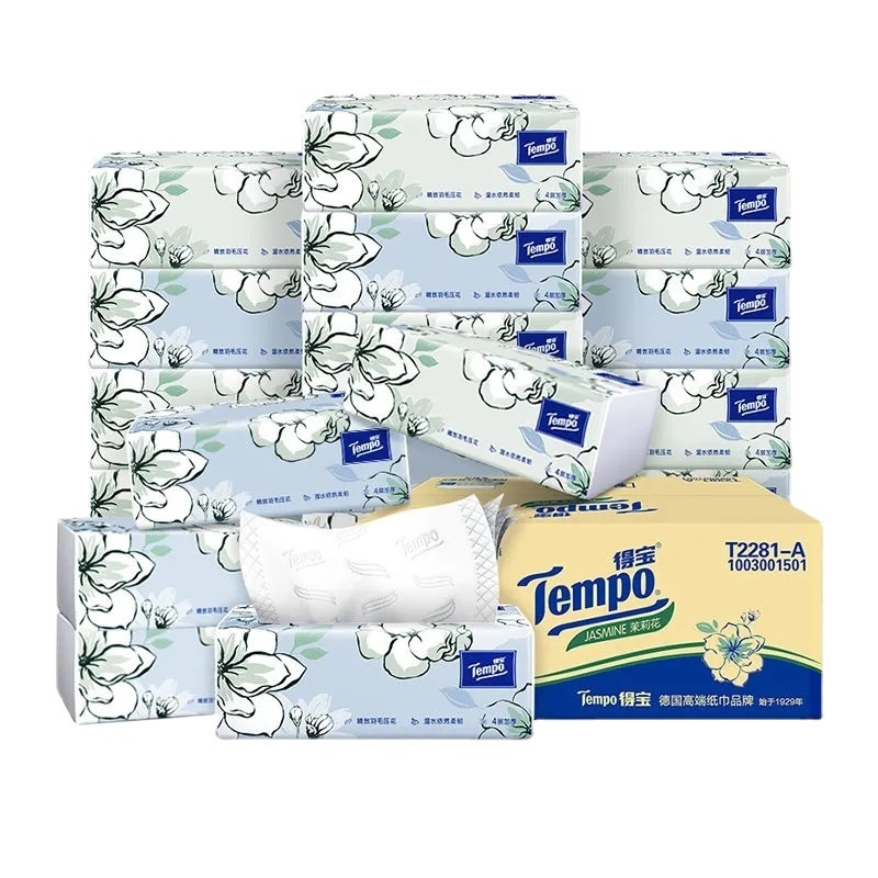 雅致印花,清香茉莉;原生进口木浆;四层加厚,湿水不破,无纸屑