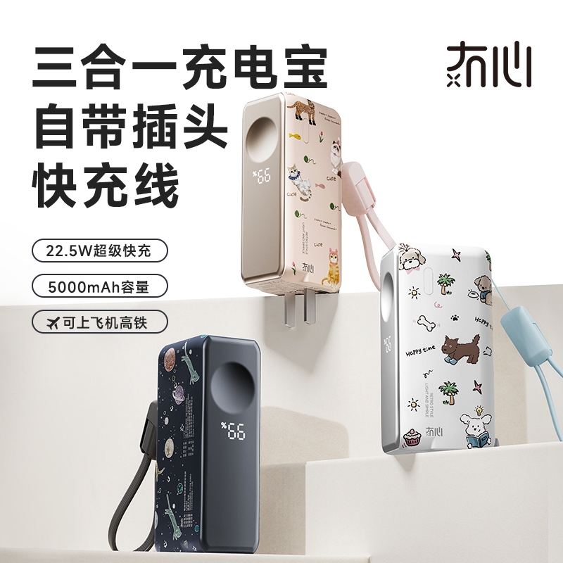 自带充电头,复古造型,自带双线快充,超迷你,卡片大;自带苹果/TC双线,USB-C:快充(22.5W);多重安全保护