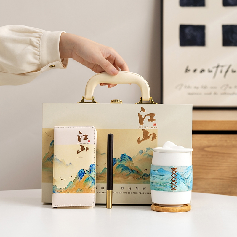 礼盒材质完美,采用千里江山融入礼盒;滤茶采用茶水分离过滤几乎没有茶渣;套装丰富有笔记本与黑笔