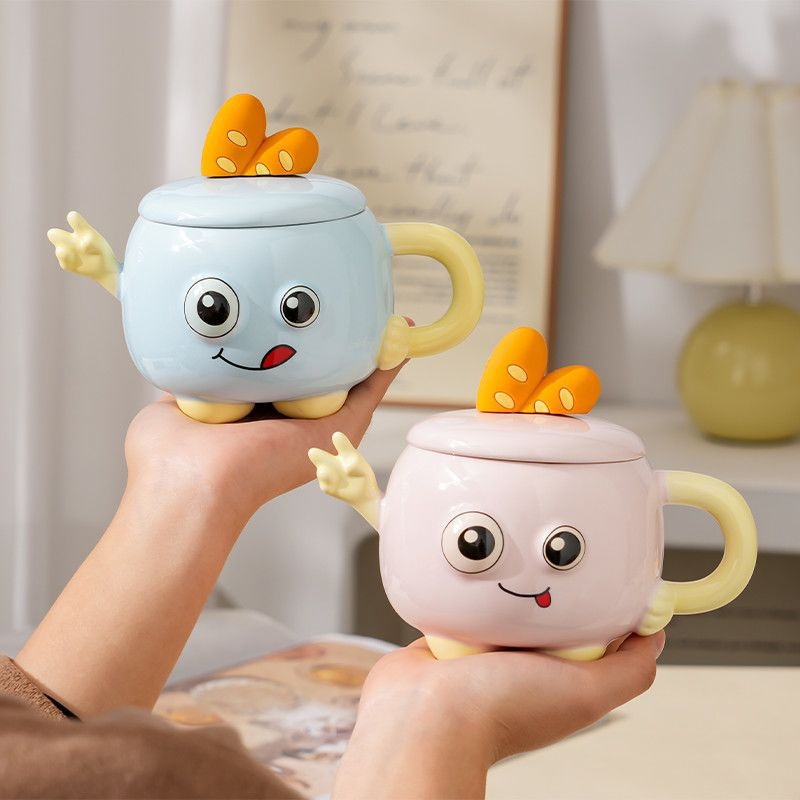 可爱举手比耶调皮表情;一体成型,高温烧制;含盖