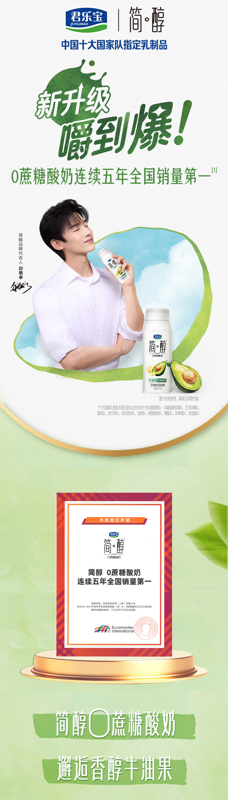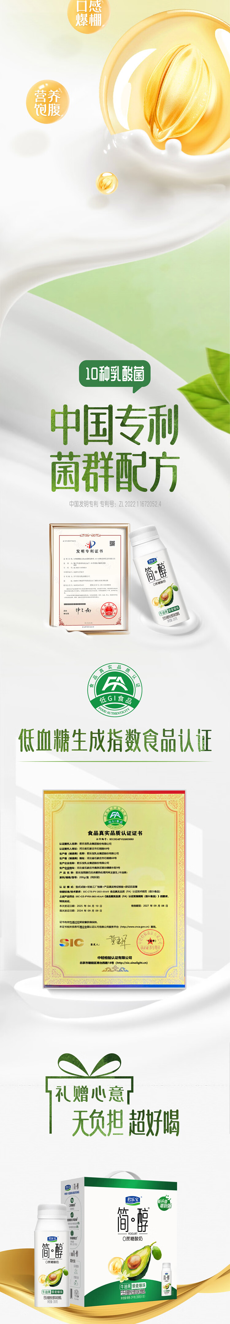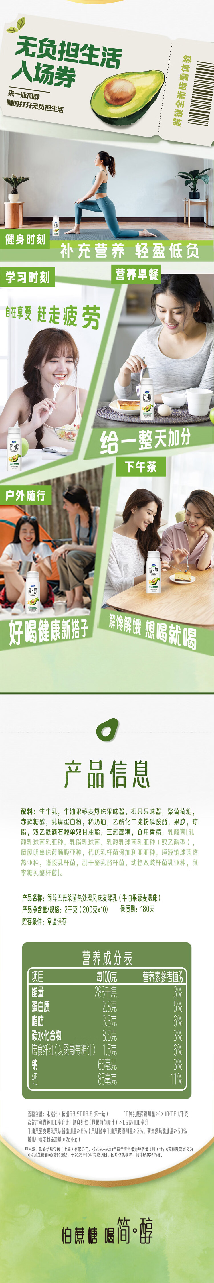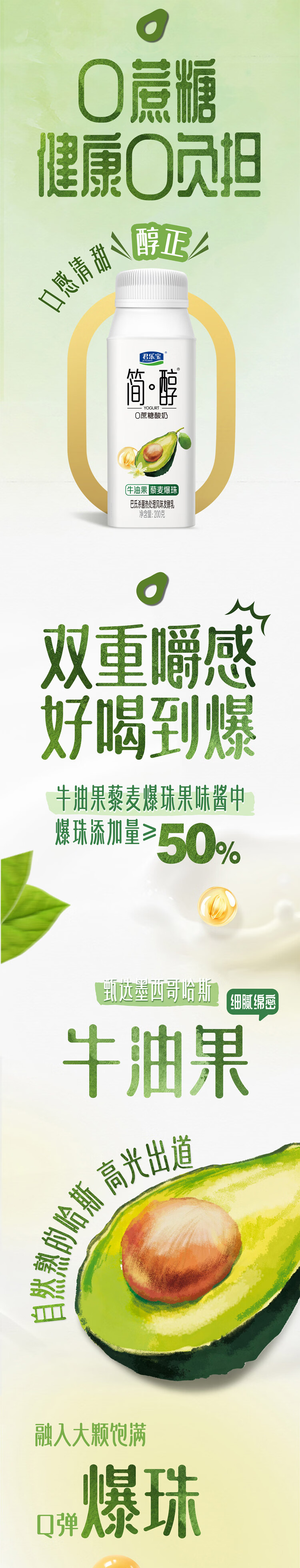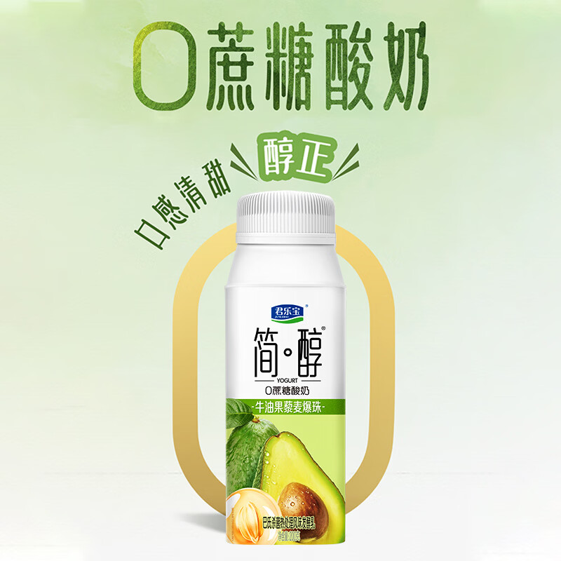 0 添加蔗糖:延续简醇系列的健康定位,不添加蔗糖;采用 100% 生牛乳奶源,保证酸奶的醇厚口感营养;牛油果的清新果香与藜麦爆珠的 Q 弹口感相结合