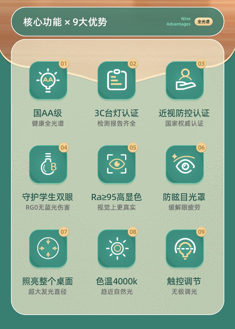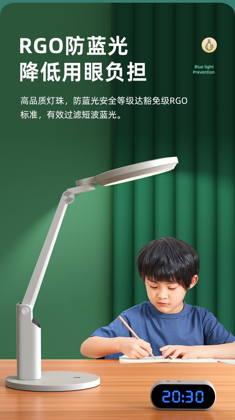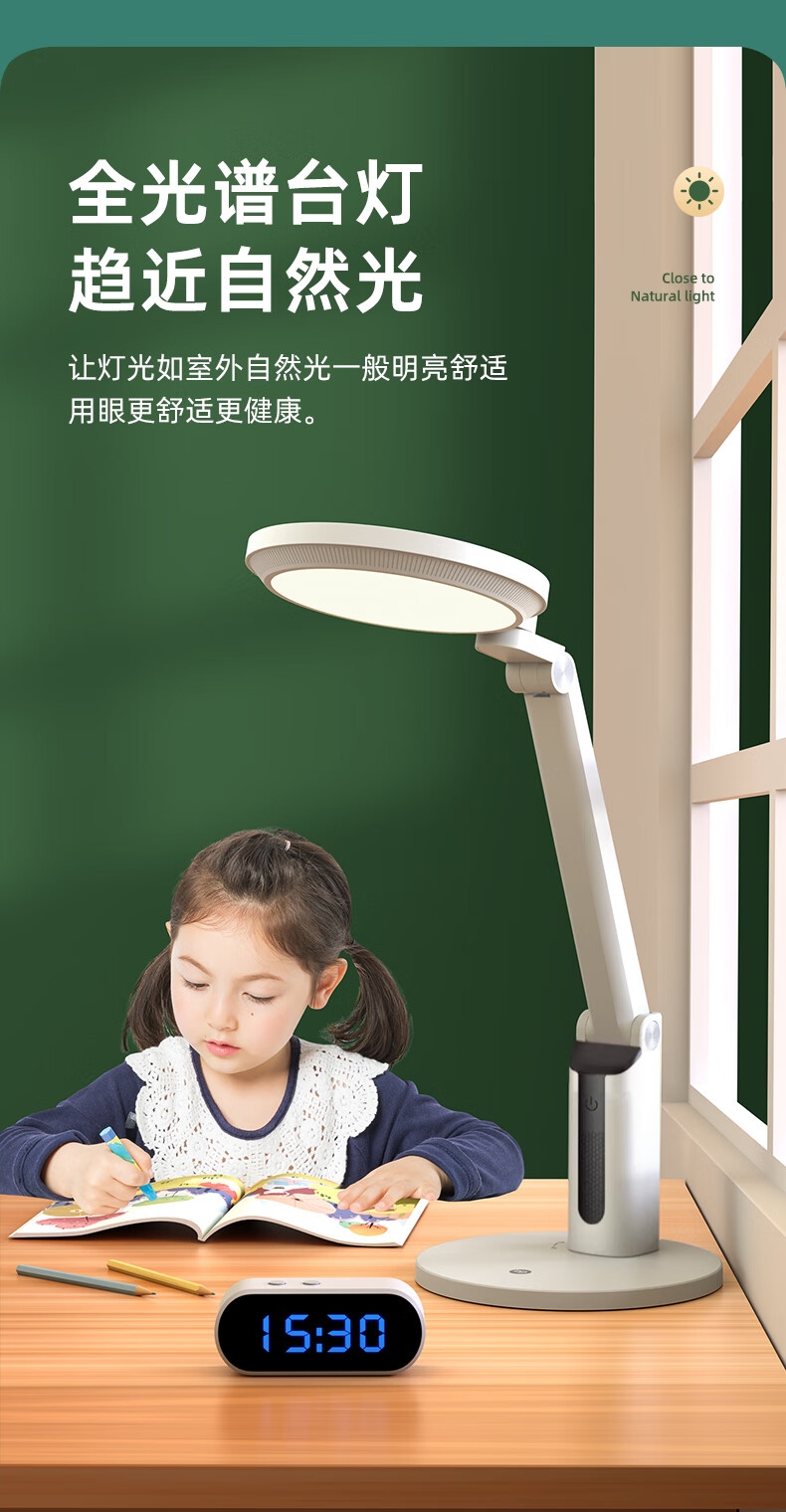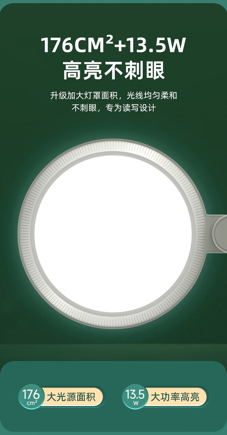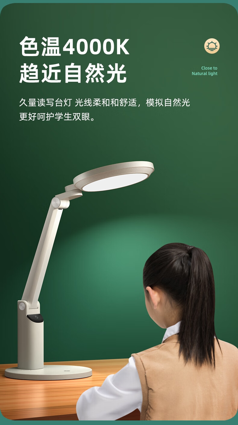 本品采用SMD LED灯珠,国AA级照度光线柔和均; 3C台灯认证,预防近视认证,全光谱台灯,趋近自然;RA≥95高显色,角度灵活可调,想照哪就照哪