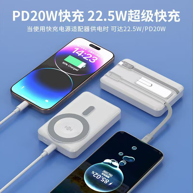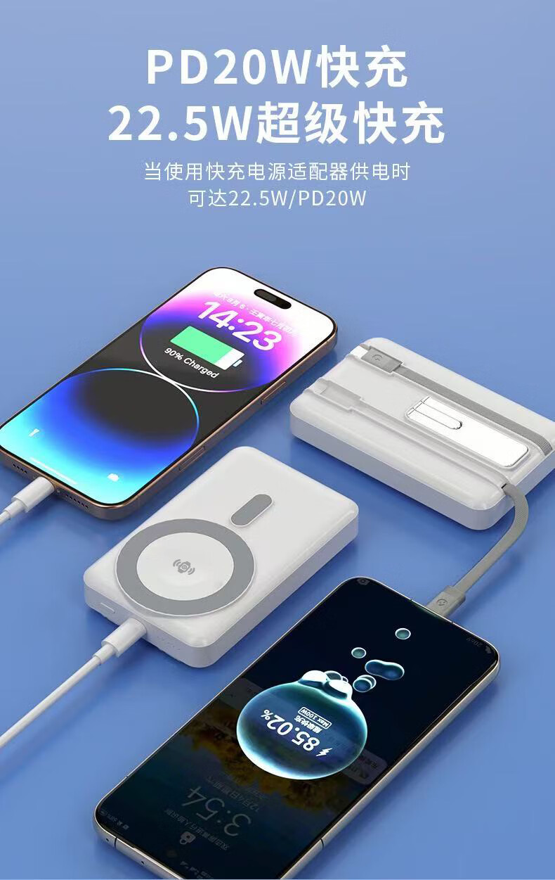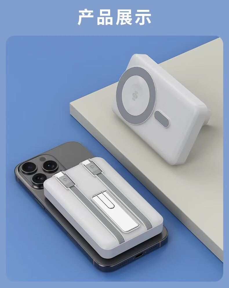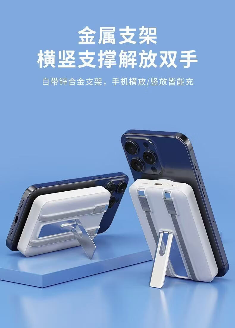 功能:多U口输出,磁吸充电,自带支架,自带数据线,无线充电