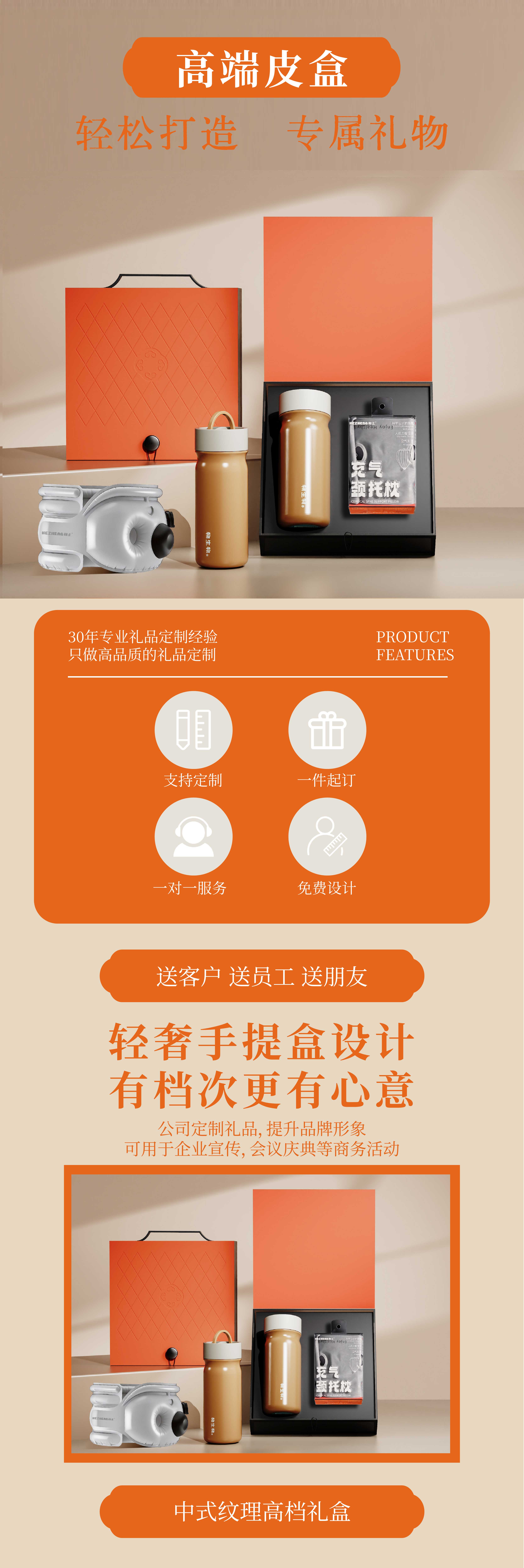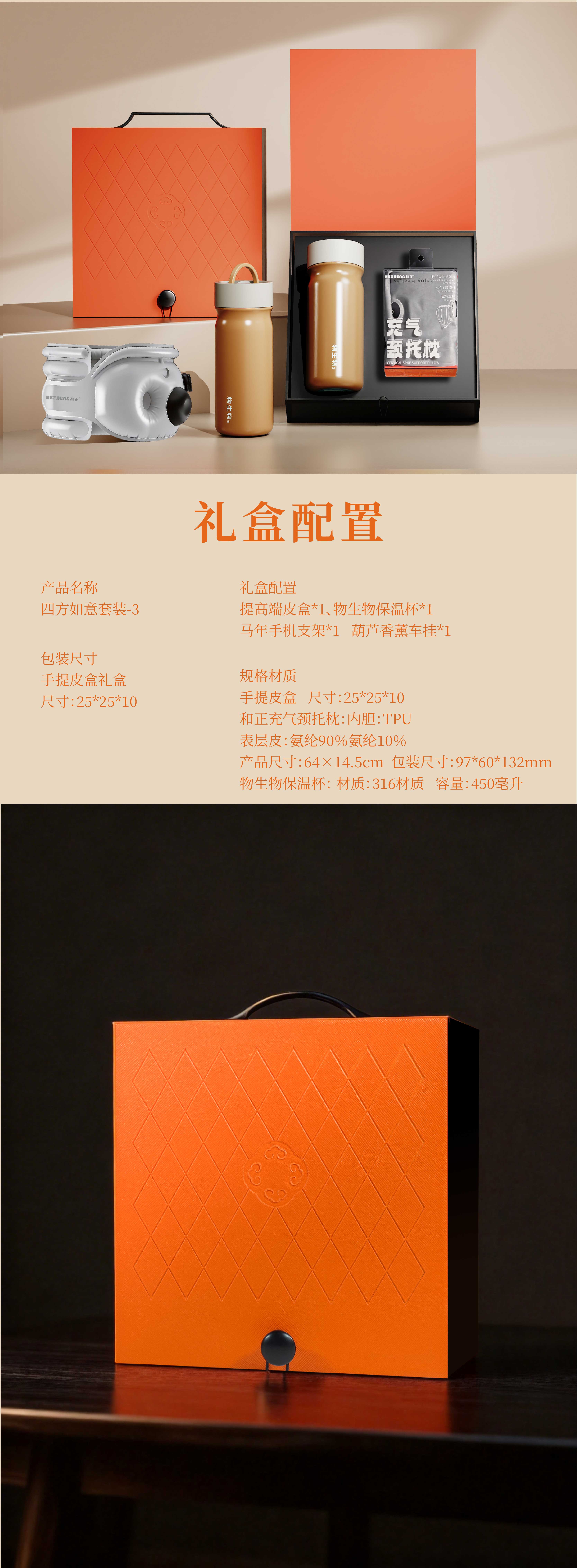 礼盒配置:手提高端皮盒*1、物生物保温杯*1、 和正充气颈托枕*1