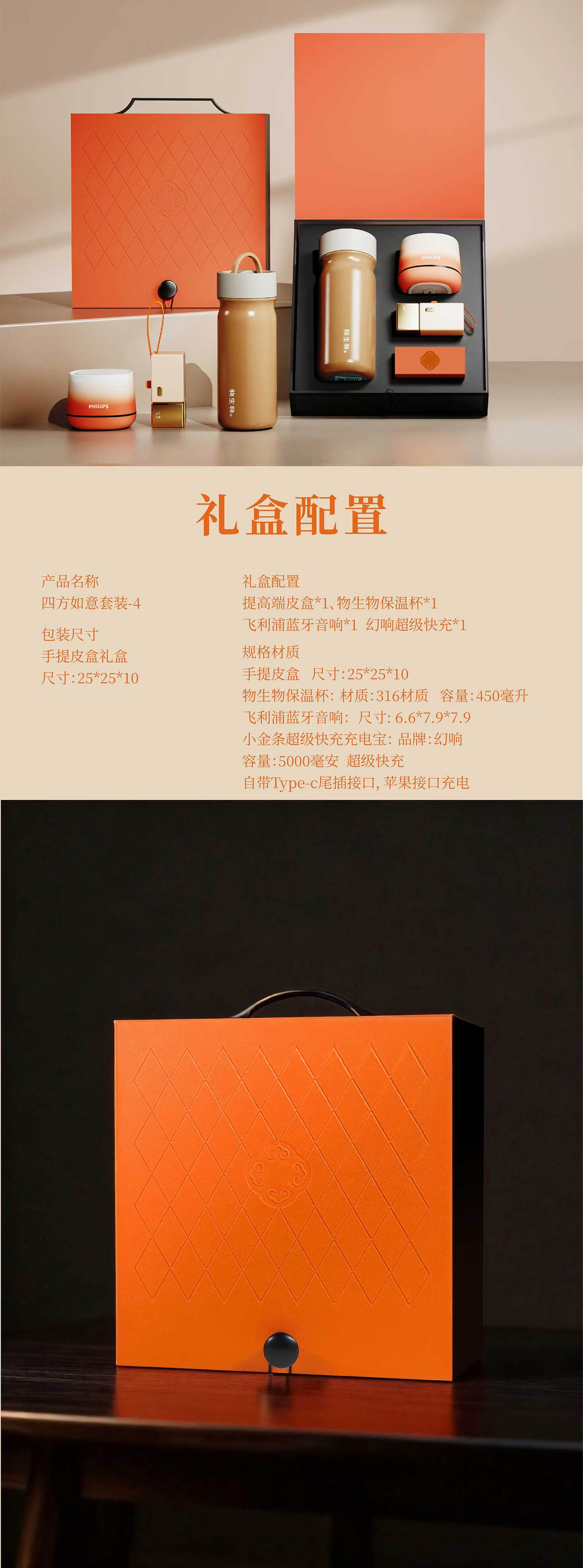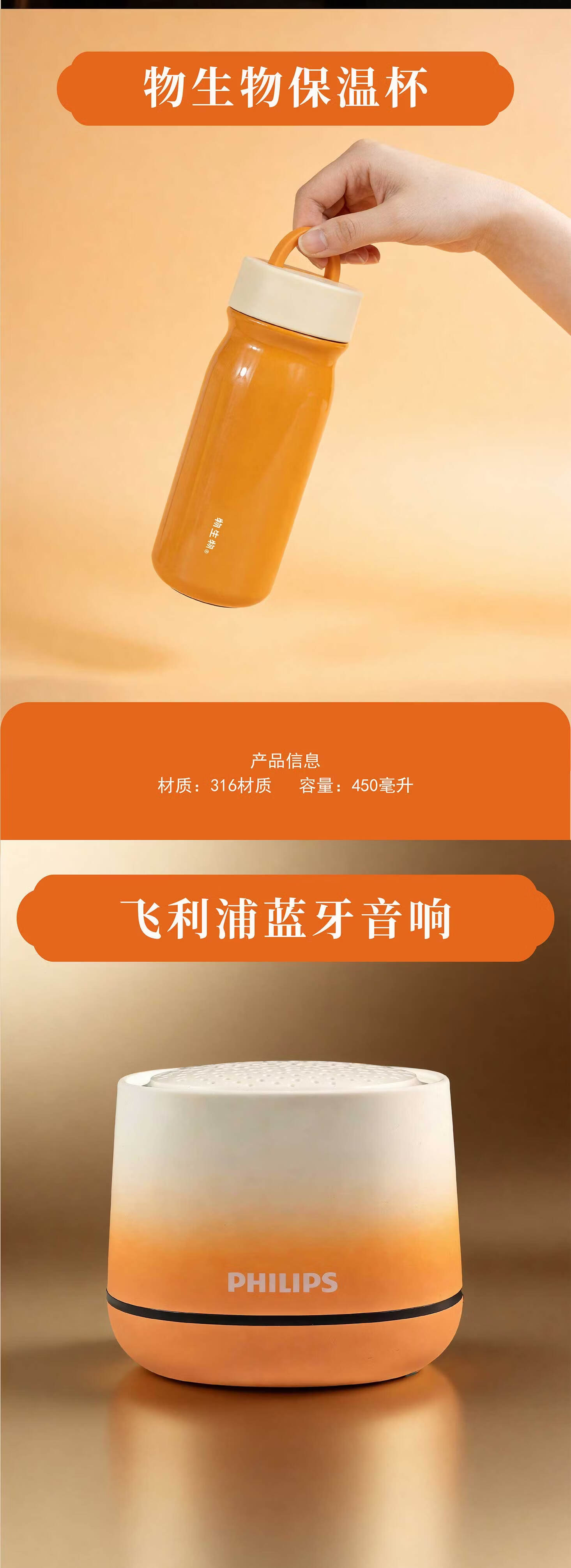 礼盒配置:手提高端皮盒*1、物生物保温杯*1 、 飞利浦蓝牙音响*1 幻响超级快充*1