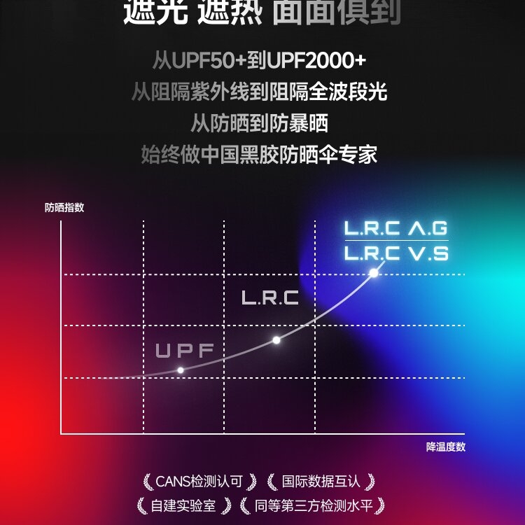 旗舰L.R.C黑胶、UPF50+防晒遮热;紫外线阻隔率≥99.99%、全身防晒到脚面;热晒双抗、小巧利落、专利硬壳胶囊、可拎可背
